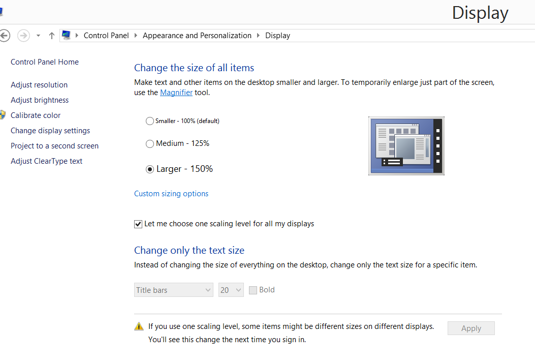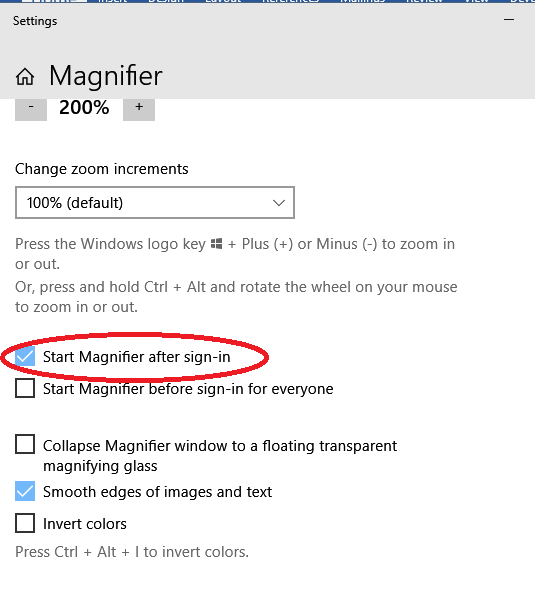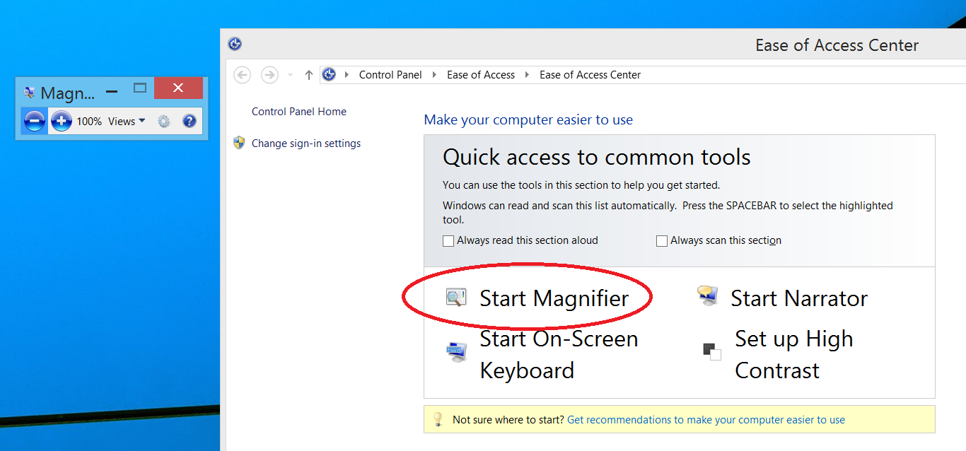 Today, I will discuss magnification option (one of the Ease of Access features) on Microsoft Windows system (Commercial magnification software is excluded in this blog). There are a few ways to increase magnifications and many instructions are available for Windows, but the following steps can be used as a quick reference on both Windows 10 and Windows 8.1 computers. You may need someone’s help initially. If you still have a Windows XP computer, please let me know and I will find the information.