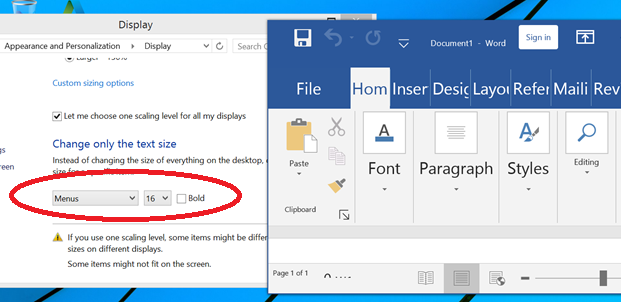 If you want to change only the fonts (Text) size, use the ‘Change only the text size’ option. As you see, the menu in the MS Word is enlarged.